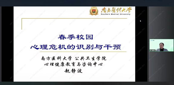 为进一步增强我校师生的心理健康意识,有效预防和干预校园心理危机,3月6日晚,我校团委(心理健康教育中心)组织二级学院心理辅导站站长、全校辅导员及学生心理朋辈辅导员等关键人员一起收听了南方医科大学赵静波教授讲授的“校园心理危机识别与干预”网络公益讲座。