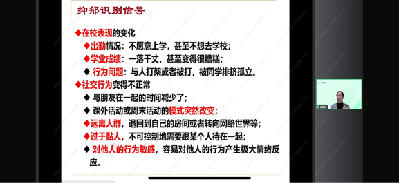 赵教授深入浅出地讲解了心理危机的定义、危机的类型,以及如何识别和干预双向障碍、抑郁、关系妄想症和精神分裂症等心理健康问题。通过临床案例分析,赵教授详细讲解了面对心理危机时的干预策略,包括急性期干预、长期稳定化处理以及危机后的心理支持和复原策略。赵教授强调,心理健康教育应以积极向上的人生观为指导,通过校园内外各类活动,以及线上线下结合的教学模式,以学生的成长发展为中心,促进学生自我认识、自信心提升及社会适应能力增强