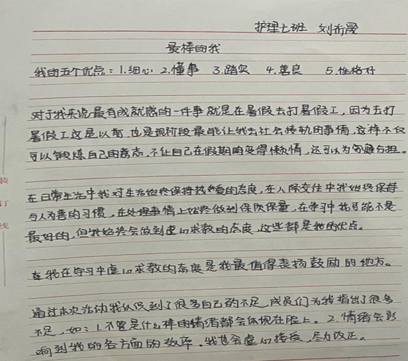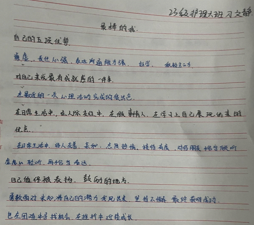 “戴高帽”活动明知己。主要对象为2023级全体在校大学生。通过此次“戴高帽”活动让学生知道自己有哪些优势品质,进而在生活和学习上多使用自己的优势。学会欣赏他人,学会关注自己和同学的优点。每个大学生以“最棒的我”为主题,自制一张卡片,在本班教室中特定位置统一展出,从而激励自己积极向上的学习心态,促进同学间团结友爱。