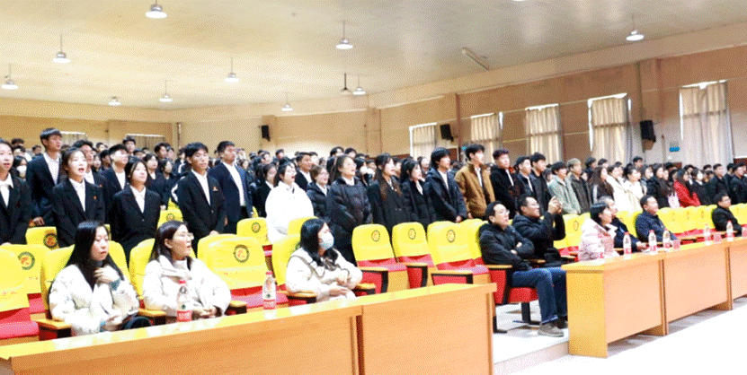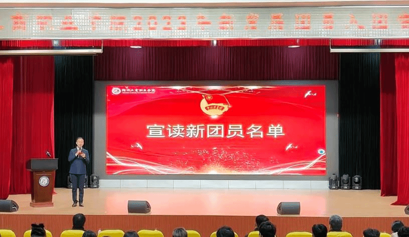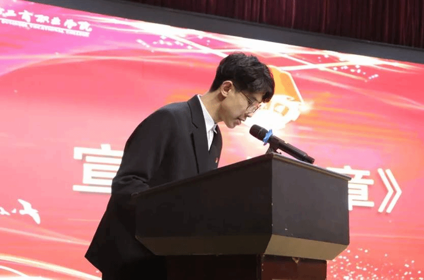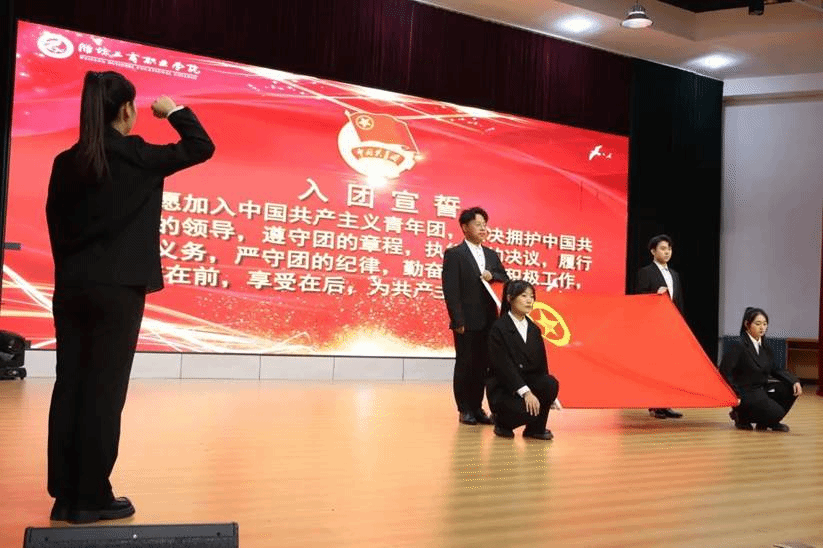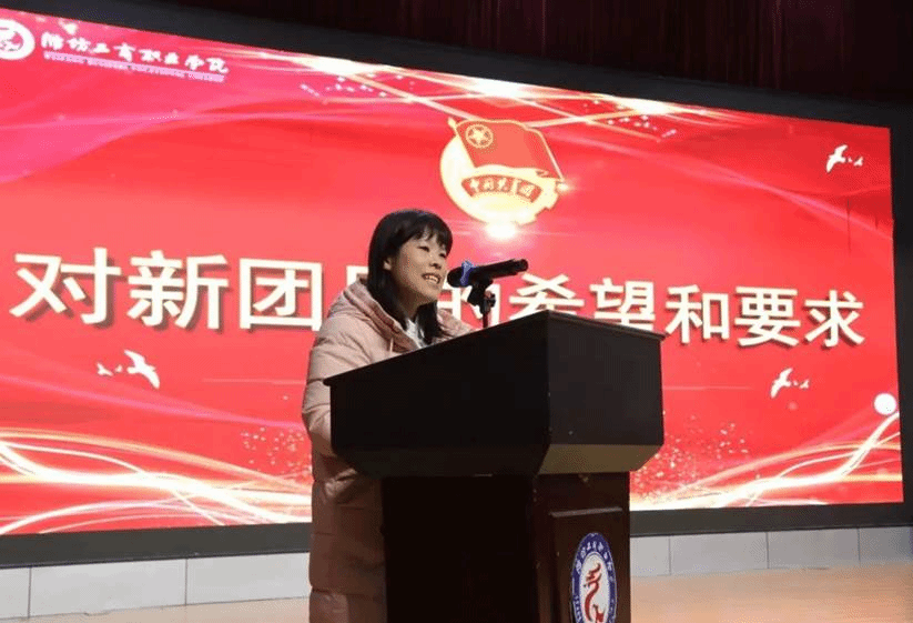 峥嵘百年路,奋发新时代。为加强我校共青团队伍建设,激励青年坚定理想信念,激扬青春力量,激发作为共青团员的光荣感和责任感,吸收一批优秀青年学子加入共青团组织,为团组织增添新的血液,增添新生力量。2023年12月4日下午,我校在第一报告厅举行了新团员入团宣誓仪式。整个仪式由团委孙淑蕾老师主持,共有九项内容。诸城市团市委书记李季、潍坊工商职业学院党委副书记、副校长刘国庆、学生处处长柴元昌、团委书记朱耀秀出席了本次仪式,团委全体老师、二级学院党团书记、部分学生干部、老团员代表、以及本年度新发展的435名团员也参与了本次仪式。