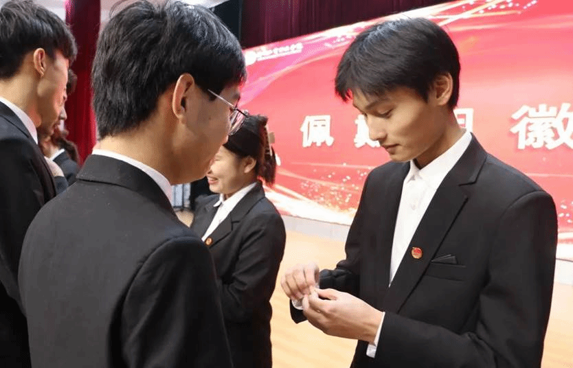 老团员们为新团员们佩戴团徽,佩戴在每位团员左胸前的团徽,是共青团肩负重任的标志。