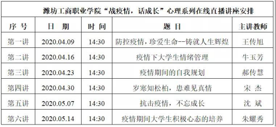 为深入贯彻落实习近平总书记关于在新冠肺炎疫情防控工作中“加强心理干预和疏导,有针对性做好人文关怀的重要讲话精神,切实加强人文关怀和思想疏导,帮助学生缓解紧张焦虑等情绪,形成强信心、暖人心、聚民心的良好氛围,同舟共济、众志成城,打好打赢疫情防控战,潍坊工商职业学院学生处、团委、心理健康教育中心按照教育部、山东省教育厅关于开展疫情防控心理服务的工作部署,借助腾讯课堂平台,针对我校学生的需要,特推出“战疫情,话成长”心理辅导系列在线直播讲座。