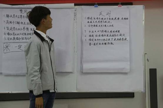 培训会上,针对“婚前性行为”的话题,牛老师对商学院各班主持人和心理部全体成员进行培训。活动过程为:主持人导入活动主题,带领大家齐读活动公约,各小组讨论赞同或反对的理由,各小组轮流分享讨论结果,主持人针对讨论结果进行总结。本次培训,让同学们以一个新的视角去了解同伴教育;让同学们学到丰富的主持技巧和同伴教育的活动流程。此次主持人培训活动进行得十分顺利,同学们大胆开放地表达自己的意见,不因敏感问题拘谨,大胆与他人交流自己内心的想法。同学们不仅学到许多平时容易被大家忽略但又极其重要的青春健康知识,而且也提升了大家做出健康、安全、负责任的决定的能力,同时学到了许多实用的主持技巧,为今后同学们自己作为主持人向周围青少年传播青春健康知识打下了坚实的基础。